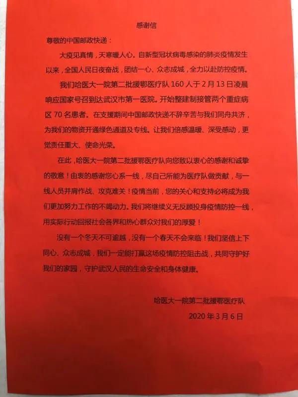 3月6日,哈醫(yī)大一院第二批援鄂醫(yī)療隊為免費寄遞個人物資服務向武漢郵政發(fā)來感謝信;3月11日,唐山、承德、張家口支援湖北醫(yī)療隊111名醫(yī)護人員通過“武漢交通”微信公眾號發(fā)表了“致敬郵政速遞人員”的文章,對武漢郵政的服務表示感謝。