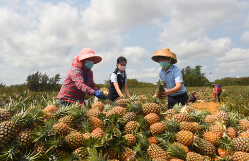 圖為文昌市支行信貸員深入菠蘿種植基地開展金融服務,與農(nóng)戶共迎豐收?! 鹾D嫌浾?nbsp; 梁磊 攝影報道