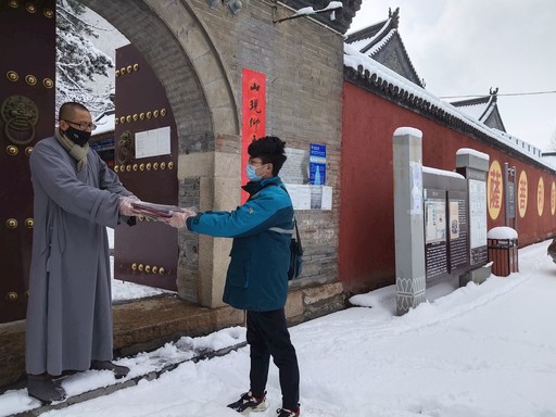 接下來,高健喻到了第二個投遞點——善財洞。由于疫情防控期間寺院實行封閉管理,到了寺院門口后,小高撥通客堂師父釋仁恒的電話,告知郵件來了。很快,釋仁恒打開厚重的寺門接過報紙說:“小高,這么大的雪你還過來了?每天看看你送來的報紙,了解天下大事,對我們也是一種很好的修行?!?/p>