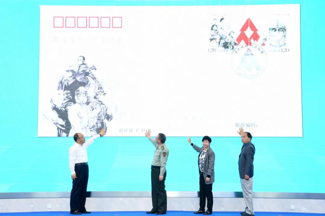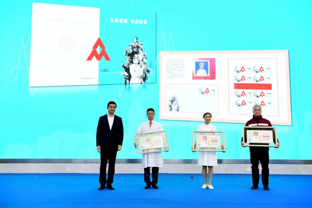 楊傳堂、梁言順、馬軍勝、李斌、梁惠玲、劉愛力、張金良共同為郵票揭幕,中央軍委后勤保障部衛(wèi)生局副局長(zhǎng)徐勤耕、財(cái)政部經(jīng)濟(jì)建設(shè)司一級(jí)巡視員宋秋玲、中國(guó)人口福利基金會(huì)副理事長(zhǎng)武家華、康寧共同為郵票首日封揭幕。劉愛力向中國(guó)紅十字會(huì)總會(huì)捐贈(zèng)抗擊疫情慈善款,張金良向北京醫(yī)院呼吸與危重癥醫(yī)學(xué)科副主任許小毛,北京大學(xué)人民醫(yī)院護(hù)理部護(hù)士長(zhǎng)趙彥,中國(guó)疾控中心駐黃岡檢測(cè)隊(duì)隊(duì)長(zhǎng)、病毒病所曾毅院士實(shí)驗(yàn)室副主任張曉光三名抗擊疫情醫(yī)務(wù)工作者代表捐贈(zèng)郵折。