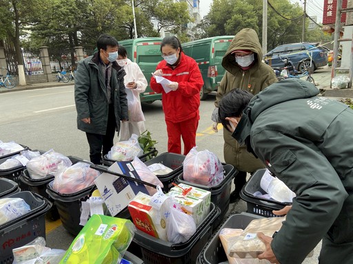 在湖北荊州,當?shù)剜]政為小區(qū)居民配送生活物資。熊程程 攝