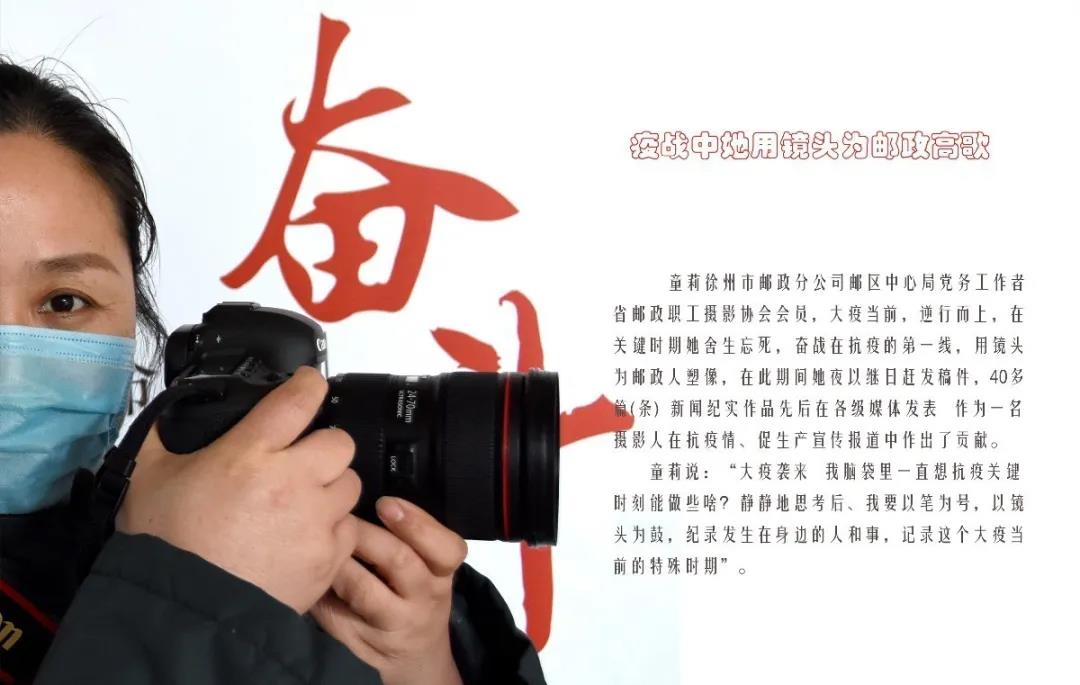 童莉,江蘇省徐州市郵政分公司郵區(qū)中心局黨務工作者。大疫當前,逆行而上,在關(guān)鍵時期她舍生忘死,奮戰(zhàn)在第一線,用鏡頭為郵政人塑像,疫情期間有40多篇(條)新聞紀實作品先后在各級媒體發(fā)表,在抗疫情促生產(chǎn)宣傳報道中作出了應有的貢獻。