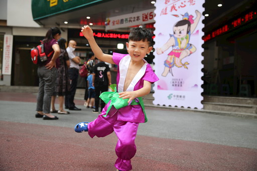6月1日,重慶市沙坪壩區(qū)三峽廣場郵政支局門前,前來購買《動(dòng)畫—葫蘆兄弟》郵票的小朋友和家長絡(luò)繹不絕,郵票上栩栩如生的葫蘆兄弟形象吸引了小朋友的目光。三峽廣場支局還特意為到場的小朋友準(zhǔn)備了葫蘆兄弟同款服裝,供小朋友拍照留念。一位小朋友穿上葫蘆兄弟服裝后,在支局門前興奮地手舞足蹈?! 踔靵喞?nbsp; 攝影報(bào)道