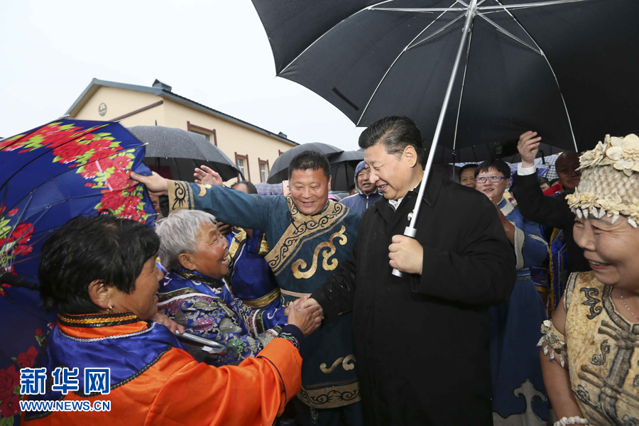 2014年春節(jié)前夕,習(xí)近平來到內(nèi)蒙古,看望慰問各族干部群眾。他來到錫林浩特市寶力根蘇木(鄉(xiāng))冬季那達(dá)慕,同牧民們一起觀摔跤,看賽馬,聽長調(diào),賞歌舞。在傳統(tǒng)的“五畜祈?!眱x式上,他按照蒙古族習(xí)俗,用無名指蘸上銀碗盛著的鮮牛奶彈了三下,祝福來年風(fēng)調(diào)雨順,五畜興旺,人民幸福安康。