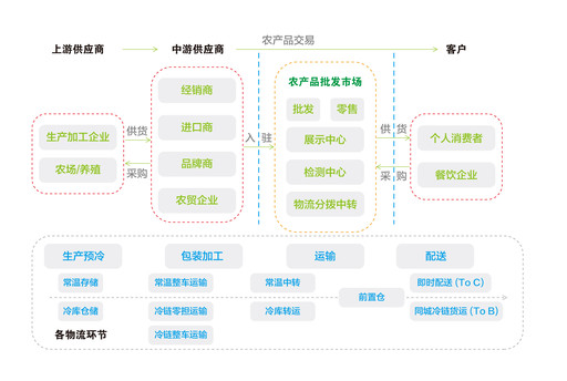 農(nóng)產(chǎn)品供應(yīng)鏈?zhǔn)且赞r(nóng)產(chǎn)品供應(yīng)為核心,由原材料供應(yīng)商、生產(chǎn)商、加工者、物流服務(wù)和消費(fèi)者等構(gòu)建的一種組織形式和網(wǎng)絡(luò)架構(gòu),涉及物流、資金流及信息流。其中,農(nóng)產(chǎn)品物流擔(dān)當(dāng)著暢通供需渠道的角色,對農(nóng)產(chǎn)品流通中人、貨、場資源的深度融合起著重要的支撐作用。與工業(yè)物流基本功能相似,農(nóng)產(chǎn)品物流也具備運(yùn)輸、儲存、流通、加工、配送、裝卸搬運(yùn)﹑包裝和信息處理等基本功能。從溫度、重量、速度的角度來看,又分別涉及冷鏈物流,農(nóng)產(chǎn)品零擔(dān)運(yùn)輸及近幾年興起的前置倉、即時(shí)配送等。