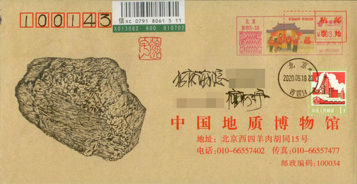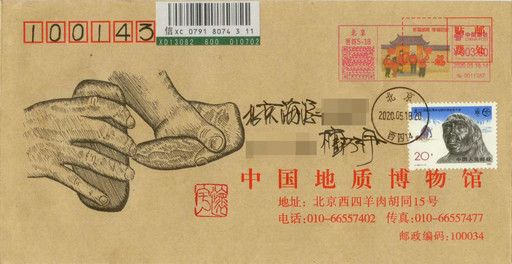 燧石俗稱“火石”,是一種含硅、質(zhì)密堅硬的巖石,破碎后形成鋒利的斷口,對敲產(chǎn)生火星,能夠引燃干草木。相傳,燧石取火法是燧人氏發(fā)明的,這種更簡易的取火方式讓人類得以真正控制火種、掙脫黑暗的束縛。在這枚“燧石取火”手繪封上,我加貼了“北京猿人”郵票,雖然他們已經(jīng)離我們遠去,但火種將我們聯(lián)系在了一起,作為“晚期智人”的后代,我向他們致以問候。