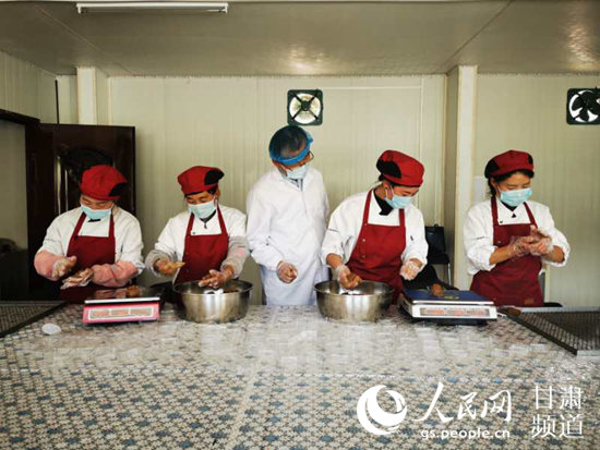 工作人員制作糌粑點心。(郵儲銀行甘肅省分行供圖)