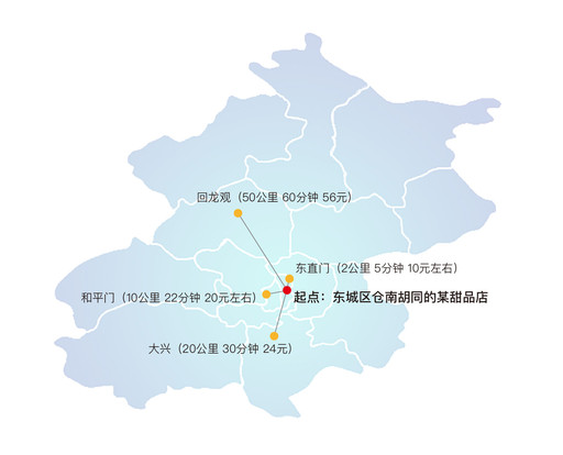 以北京市東城區(qū)倉(cāng)南胡同的某甜品店為坐標(biāo),選擇即時(shí)配服務(wù),剔除高峰時(shí)段的附加費(fèi)用,我們來(lái)看一下統(tǒng)計(jì)數(shù)據(jù)。(見(jiàn)表6)