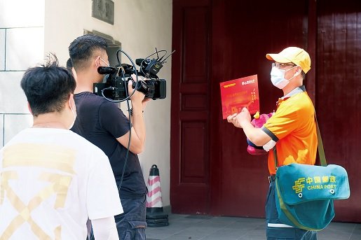 日前,中央廣播電視總臺央視頻和中國郵政分別在北京、上海和四川阿壩開展了“高考錄取通知書駕到”的直播。從繁華的城市到偏遠(yuǎn)的鄉(xiāng)村,郵政投遞員秉承“人民郵政為人民”的宗旨,克服各種困難,保證將錄取通知書及時、準(zhǔn)確、安全送到考生手中。據(jù)悉,中國郵政和央視頻還聯(lián)合推出高考錄取通知書寄遞在線查詢服務(wù)系統(tǒng),考生可在線查詢錄取通知書的寄遞情況。圖為央視頻攝制組、上海郵政投遞員在39攝氏度高溫下直播錄取通知書投遞。