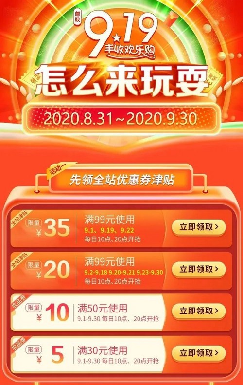 專題首頁> > 中國郵政集團有限公司 > 個性化專題 > 郵政919 豐收歡樂購 > 走進919 > 燃爆9月!郵政919豐收歡樂購讓你連嗨1個月...