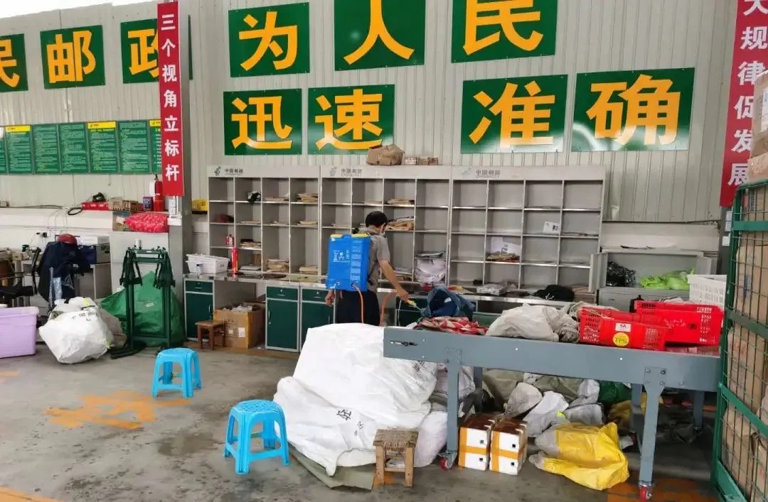 瑞麗市分公司郵件處理中心對(duì)郵件及生產(chǎn)區(qū)域進(jìn)行消毒