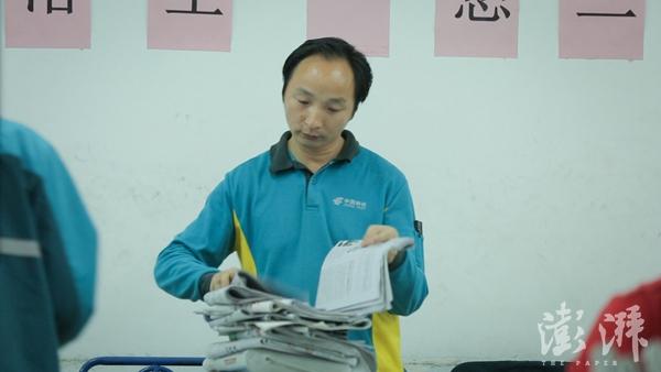郭振濤:我今年40歲,江蘇高郵人,在上海市臨平路郵局工作已經(jīng)12年了。日常就是早上五六點(diǎn)鐘到郵局來進(jìn)行信件分揀,把自己那塊區(qū)域的挑出來。挑出來以后,按你的投遞路線把它排好,排好再處理報(bào)刊書籍,正常在單位忙完要到10點(diǎn)鐘左右出去。出去投遞三四個(gè)小時(shí),到中午忙的時(shí)候可能連吃飯的時(shí)間都沒有。下午郵件報(bào)籍又來一批,然后出去再跑一趟三個(gè)小時(shí),差不多能結(jié)束工作。一天是也很忙的。