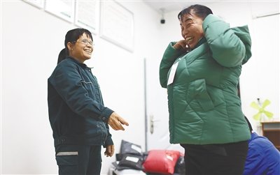 一位阿姐在符蓮香面前試穿剛郵寄到的新衣服。