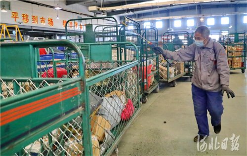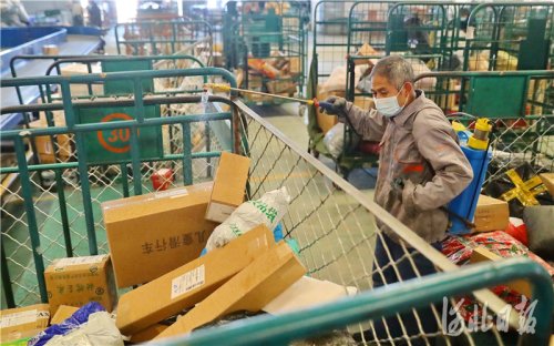 2021年1月7日,位于河北省秦皇島市海港區(qū)臨港物流園區(qū)的中國郵政集團(tuán)有限公司秦皇島市分公司網(wǎng)路運(yùn)營中心內(nèi),工作人員在對快遞包裹進(jìn)行消殺。
