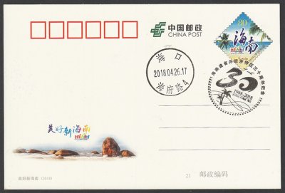 為慶祝海南建省辦經(jīng)濟特區(qū)30周年,2018年中國郵政發(fā)行了《美好新海南》普通郵資信封、普通郵資明信片,郵資圖都印有海南旅游徽志。