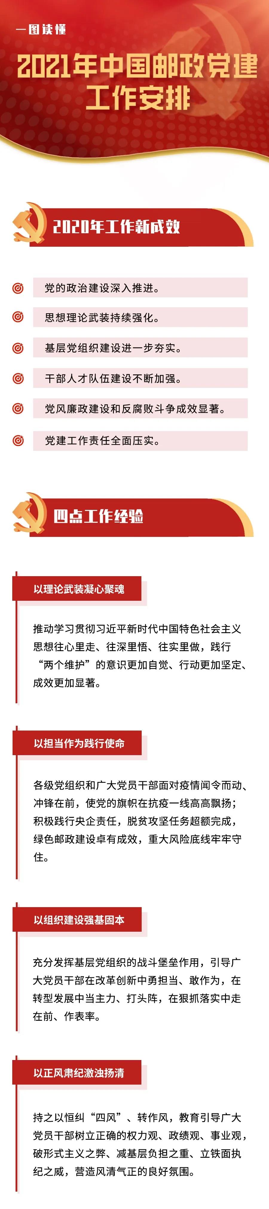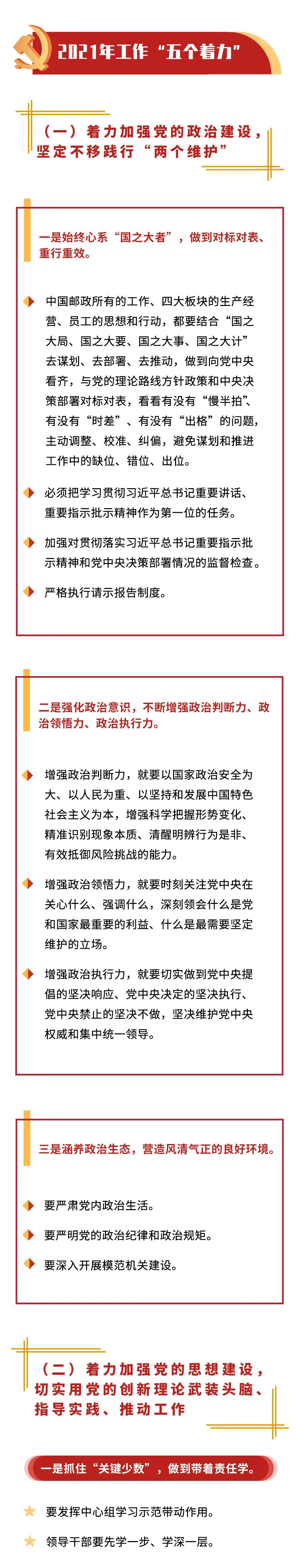 1月28日,2021年中國(guó)郵政集團(tuán)有限公司黨的建設(shè)暨黨風(fēng)廉政建設(shè)和反腐敗工作會(huì)議召開(kāi)。這次會(huì)議是在中國(guó)郵政立足新階段、邁向新征程的重要時(shí)刻提升政治站位、激發(fā)擔(dān)當(dāng)作為、凝心聚力推動(dòng)發(fā)展的一次政治動(dòng)員。會(huì)議總結(jié)2020年中國(guó)郵政黨的建設(shè)以及黨風(fēng)廉政建設(shè)和反腐敗工作,部署2021年重點(diǎn)任務(wù),提出把2021年作為“黨建質(zhì)量提升年”,以高質(zhì)量黨建引領(lǐng)高質(zhì)量發(fā)展,為打造“六維共生”的新郵政、推動(dòng)中國(guó)郵政二次崛起提供堅(jiān)強(qiáng)政治保證。