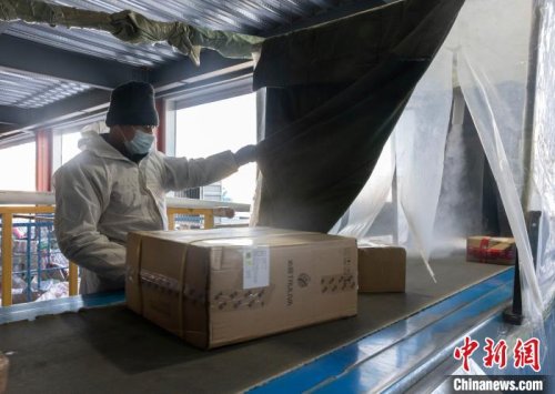 工作人員手持噴霧器對快遞郵件進行消殺。 楊迪 攝