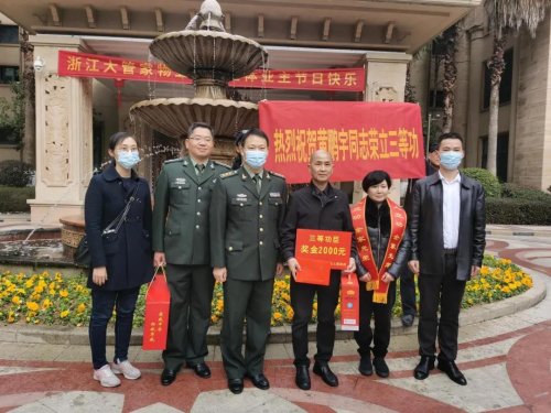 現(xiàn)場(chǎng)為立功軍人豎起大幅海報(bào)