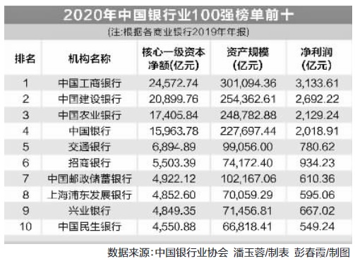 中國銀行業(yè)協(xié)會最新一期“中國銀行業(yè)100強榜單”出爐。2020年榜單前十名的銀行分別是:工商銀行、建設(shè)銀行、農(nóng)業(yè)銀行、中國銀行、交通銀行、招商銀行、郵儲銀行、浦發(fā)銀行、興業(yè)銀行及民生銀行。