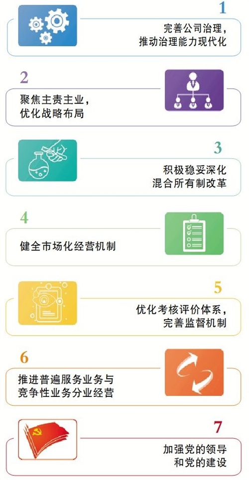 2.七個方面重點(diǎn)改革任務(wù)?!秾?shí)施方案》根據(jù)中國郵政改革落地過程中遇到的重點(diǎn)難點(diǎn)問題,提出:一是完善公司治理,推動治理能力現(xiàn)代化,全面貫徹“兩個一以貫之”,把黨的領(lǐng)導(dǎo)融入公司治理各環(huán)節(jié),實(shí)現(xiàn)制度化、規(guī)范化、程序化,加強(qiáng)董事會建設(shè),落實(shí)董事會職權(quán),保障經(jīng)理層依法行權(quán)履職,開展對標(biāo)世界一流企業(yè)管理提升行動,加強(qiáng)各類風(fēng)險(xiǎn)管控,完成子企業(yè)公司制改制。二是聚焦主責(zé)主業(yè),優(yōu)化戰(zhàn)略布局,圍繞服務(wù)國家戰(zhàn)略,構(gòu)筑中國郵政高質(zhì)量發(fā)展的“四梁八柱”,推動普遍服務(wù)能力提升,推動寄遞業(yè)務(wù)核心競爭力提升,推動郵儲銀行高質(zhì)量發(fā)展,推動代理金融轉(zhuǎn)型發(fā)展,推動中郵保險(xiǎn)價(jià)值發(fā)展,推動農(nóng)村電商生態(tài)圈建設(shè),推動惠農(nóng)合作項(xiàng)目協(xié)同發(fā)展,推動資產(chǎn)重組與盤活,推動自主創(chuàng)新能力提升,清理退出不具備競爭優(yōu)勢的非主營業(yè)務(wù)和低效無效資產(chǎn),完成剝離國有企業(yè)辦社會職能,解決歷史遺留問題。三是積極穩(wěn)妥深化混合所有制改革,把握好改革方向,務(wù)求改革實(shí)效,避免盲目性,避免一混了之。按照完善治理、強(qiáng)化激勵、突出主業(yè)、提高效率的要求,堅(jiān)持因地施策、因業(yè)施策、因企施策,宜獨(dú)則獨(dú)、宜控則控、宜參則參,分層分類深化混合所有制改革,穩(wěn)慎開展混合所有制企業(yè)骨干員工持股,推動混合所有制企業(yè)深度轉(zhuǎn)化經(jīng)營機(jī)制,加強(qiáng)對混合所有制改革全過程的監(jiān)督,防止國有資產(chǎn)流失。四是健全市場化經(jīng)營機(jī)制,強(qiáng)化各層級郵政企業(yè)、控股子公司市場主體地位,切實(shí)深化勞動、人事、分配三項(xiàng)制度改革,推行經(jīng)理層成員任期制和契約化管理,全面推進(jìn)用工市場化,完善市場化薪酬分配機(jī)制,穩(wěn)慎開展控股子公司中長期激勵。五是優(yōu)化考核評價(jià)體系,完善監(jiān)督機(jī)制,完善戰(zhàn)略績效考核評價(jià)體系,健全協(xié)同高效的監(jiān)督機(jī)制。六是認(rèn)真貫徹落實(shí)《關(guān)于新時(shí)代加快完善社會主義市場經(jīng)濟(jì)體制的意見》要求,推進(jìn)普遍服務(wù)業(yè)務(wù)與競爭性業(yè)務(wù)分業(yè)經(jīng)營。七是加強(qiáng)黨的領(lǐng)導(dǎo)和黨的建設(shè),加強(qiáng)黨的政治建設(shè),推進(jìn)黨建工作與生產(chǎn)經(jīng)營深度融合,加強(qiáng)領(lǐng)導(dǎo)班子建設(shè)和人才隊(duì)伍建設(shè),激勵領(lǐng)導(dǎo)人員擔(dān)當(dāng)作為,持續(xù)深入推進(jìn)全面從嚴(yán)治黨。