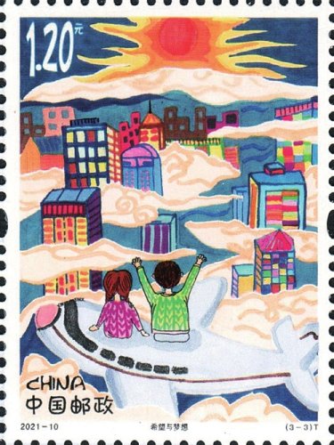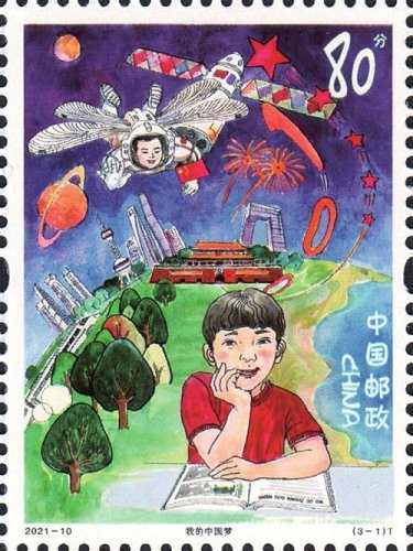 登上《兒童畫作品選》特種郵票的3幅作品“我的中國(guó)夢(mèng)”“國(guó)粹之韻”和“希望與夢(mèng)想”,分別由上海市同濟(jì)小學(xué)的楊曉芒、合肥新站壽春實(shí)驗(yàn)中學(xué)的費(fèi)玉婷、上海市周浦第三小學(xué)的錢昕逸3位小朋友設(shè)計(jì)。第一枚通過描繪我國(guó)航空航天事業(yè)、城市、交通網(wǎng)絡(luò)繁榮發(fā)展等場(chǎng)景,表達(dá)了少年兒童不斷追尋探索宇宙的夢(mèng)想以及對(duì)未來美好生活的憧憬;第二枚描繪了傳統(tǒng)文化與城市發(fā)展、現(xiàn)代科技共繁榮的場(chǎng)景,表達(dá)了少年兒童對(duì)中華優(yōu)秀文化的熱愛與傳承;第三枚描繪了偉大祖國(guó)不斷發(fā)展的場(chǎng)景,少年兒童登高望遠(yuǎn)、憧憬未來。三枚郵票緊密圍繞主題,展現(xiàn)出少年兒童對(duì)黨領(lǐng)導(dǎo)下的偉大祖國(guó)的無比熱愛、由衷禮贊和美好祝愿。