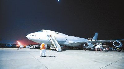 6月5日晚上,中國郵政開通的“鄭州—美國”臨時(shí)包機(jī)正在裝運(yùn)物品。 李平 攝