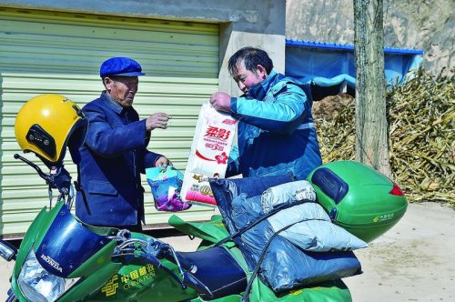 在趙滿明的摩托車上,經(jīng)常會出現(xiàn)與工作“不相符”的物品,有時是衛(wèi)生紙等生活用品,有時是瓜果蔬菜,這都是他幫投遞區(qū)域內(nèi)生活不便的群眾代買的物品?!拔颐刻於紒硗阪?zhèn)上,幫他們代買一些生活用品,都是舉手之勞。”趙滿明輕描淡寫地說。