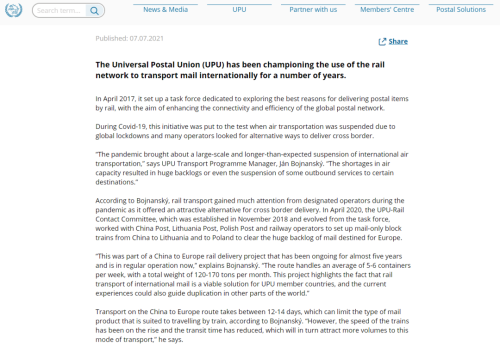 7月7日,萬國郵聯(lián)官網發(fā)布了一條有關中歐班列的報道。報道中,郵聯(lián)運輸項目組經理揚·博伊南斯基肯定了中歐班列在疫情下的重要作用。