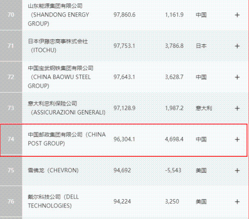 8月2日,2021年《財(cái)富》世界500強(qiáng)排行榜單新鮮出爐,中國(guó)郵政集團(tuán)有限公司排名第74位,首次挺進(jìn)世界前80強(qiáng);在上榜的世界6家郵政企業(yè)中排第2位,其中年?duì)I業(yè)收入排世界郵政第2位,利潤(rùn)排世界郵政第1位。