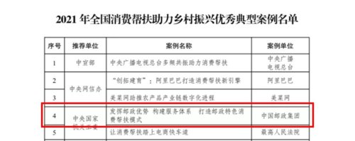12月2日,在國(guó)家發(fā)改委召開(kāi)的2021年全國(guó)消費(fèi)幫扶助力鄉(xiāng)村振興典型案例視頻推介會(huì)上,54家單位獲評(píng)2021年全國(guó)消費(fèi)幫扶助力鄉(xiāng)村振興優(yōu)秀典型案例,中國(guó)郵政榮膺其中。