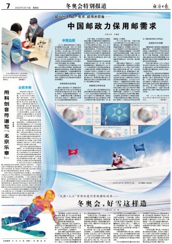 在弘揚優(yōu)秀傳統(tǒng)文化和奧林匹克文化的同時,中國郵政在郵票印制中引入先進的科技手段,以嶄新的形式呈現(xiàn)北京冬奧會的精彩魅力。以《北京2022年冬奧會——競賽場館》紀念郵票小型張為例,首次應用菲涅爾透鏡微納光刻技術。國家速滑館建設所用的剩余玻璃材料經(jīng)過特殊工藝加工成50微米的可用顆粒,摻入紅色雕刻油墨中,制作成“冰絲帶特種油墨”。在紫光燈下,方寸間的場館可以立即呈現(xiàn)出“冰絲帶”霓虹璀璨、光影流轉,場館周圍燈火輝煌的夜景?!岸瑠W會郵票郵品設計精美,很受歡迎,極大地滿足了各國運動員和來賓的需求。”國家郵政局局長馬軍勝說。