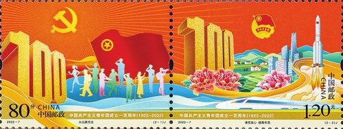 該套郵票一套2枚,分別為《永遠(yuǎn)跟黨走》和《請黨放心強國有我》?!队肋h(yuǎn)跟黨走》以黨徽與團旗為主體,團旗緊緊跟隨著黨徽,輔以數(shù)字“100”及奮斗在各行各業(yè)的青年群像剪影,突出共青團緊跟黨走的政治定位?!墩堻h放心強國有我》以共青團團徽為主體,輔以數(shù)字“100”、高鐵、火箭、樓宇等畫面內(nèi)容,寓意廣大共青團員為建設(shè)繁榮祖國、實現(xiàn)中華民族偉大復(fù)興貢獻(xiàn)青春力量的壯志豪情。