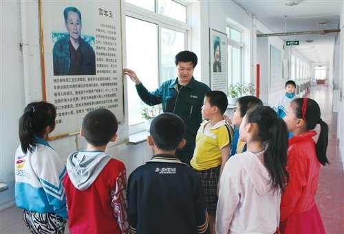 王明杰向葦沙河鎮(zhèn)小學(xué)的同學(xué)講述郵政“鐵人”宮本玉的事跡?!跬跫抑?攝