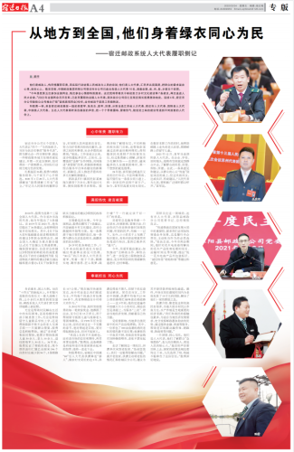 和殷勇一樣,來自宿遷郵政基層一線的吳愛軍、張良志、袁軍、洪瀟,分別當(dāng)選江蘇省人大代表、宿遷市人大代表、泗陽縣人大代表、中揚鎮(zhèn)人大代表。五名人大代表傾聽來自基層的聲音,把一個個帶著露珠、冒著熱氣、散發(fā)泥土味的建議傳遞到不同層面的人代會上。