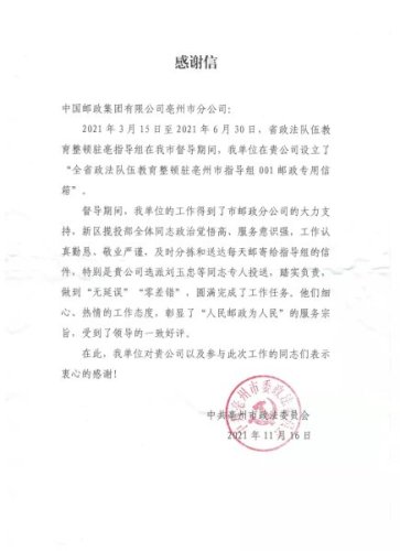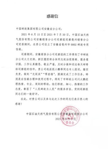 今年8月份,亳州市分公司還收到了來(lái)自中國(guó)石油天然氣股份有限公司安徽亳州銷(xiāo)售分公司的感謝信,感謝亳州市分公司在安徽銷(xiāo)售分公司巡察期間提供的高質(zhì)量郵政服務(wù)。