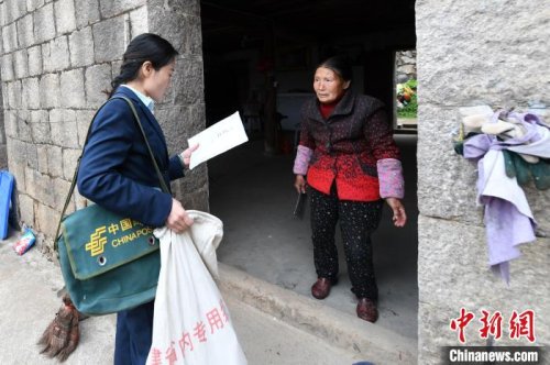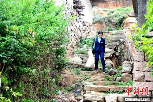 15日15時,中新網(wǎng)記者跟隨蔣玉美走村入戶,投遞郵件、報刊和各類包裹。一路上,或是陡坡,或是山間小路,崎嶇不已。