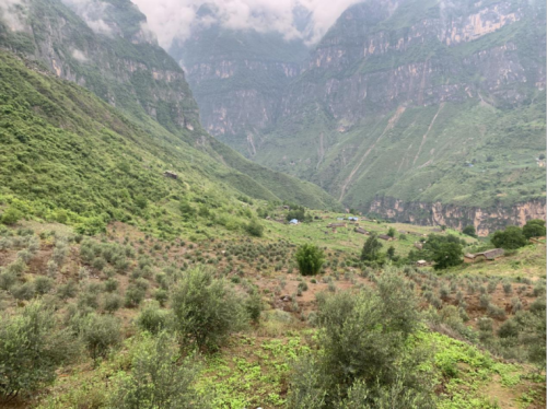 云霧縈繞的山頂上,大片油橄欖林和少許莊稼、蔬菜長勢正好,其間錯落有致地分布著一間間彝族老百姓村舍,竹墻青瓦,簡樸寧靜。在最高處,一面鮮艷的黨旗迎風(fēng)飄揚(yáng),旁邊有一家簡易民宿,可供當(dāng)天實在不能下山的游客小住。遠(yuǎn)遠(yuǎn)看去,有村民已在院外翹首以盼,等待某色爾者到來。