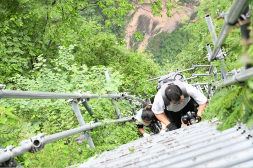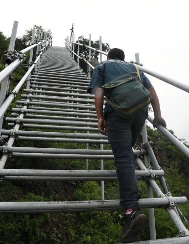 沿著石土混合的臺階而上,一會兒功夫,一段段鋼架搭成的鋼梯就映入眼簾,只見梯子每一級由2-3根獨(dú)立的鋼管焊接而成,鋼管圓圓的,感覺稍不留神很容易踏空和滑倒。