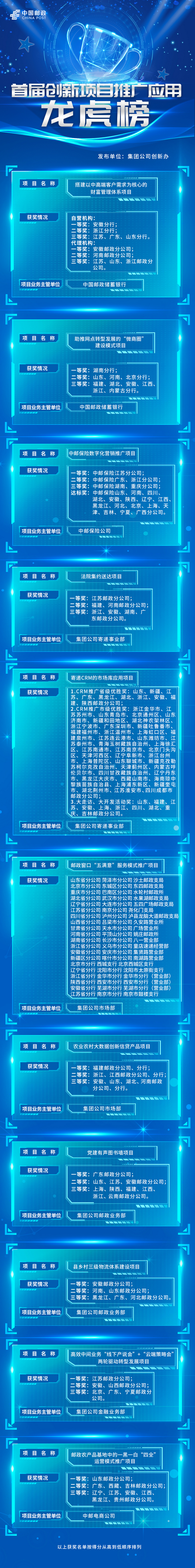 為更好地推動(dòng)優(yōu)秀創(chuàng)新項(xiàng)目推廣應(yīng)用及成果落地轉(zhuǎn)化,服務(wù)企業(yè)經(jīng)營(yíng)發(fā)展,中國(guó)郵政集團(tuán)有限公司組織開(kāi)展了首屆11個(gè)重點(diǎn)創(chuàng)新項(xiàng)目的全國(guó)推廣應(yīng)用工作,覆蓋了郵務(wù)、寄遞、金融等主要業(yè)務(wù)領(lǐng)域,推廣范圍涉及31個(gè)?。▍^(qū)、市)郵政分公司、36家郵儲(chǔ)分行、21家中郵保險(xiǎn)分公司,推廣期內(nèi)項(xiàng)目取得良好成效。
