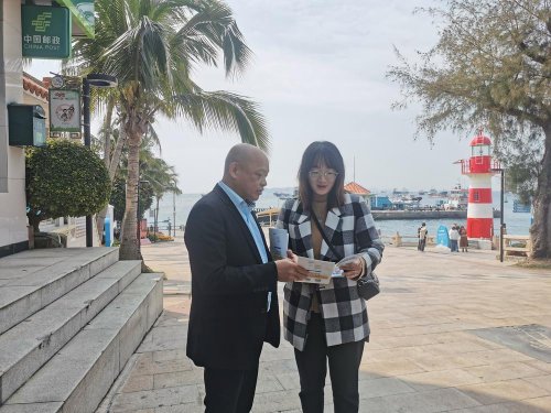 在外伶仃島上的玉帶環(huán)腰、摩崖石刻、拱橋渡水等景點(diǎn),謝堅(jiān)和稅務(wù)人員一道沿路向景區(qū)商鋪、行人游客宣講稅收優(yōu)惠政策,成為外伶仃島上一道流動(dòng)的風(fēng)景線。
