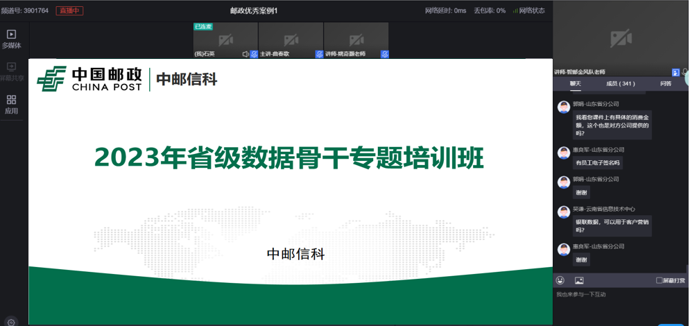 首次培訓(xùn)已于4月19日下午舉行,培訓(xùn)時(shí)長(zhǎng)2.5小時(shí),培訓(xùn)內(nèi)容為2022年數(shù)據(jù)創(chuàng)新勞動(dòng)賽優(yōu)秀案例,共三個(gè),分別是《寄遞業(yè)務(wù)客戶資費(fèi)風(fēng)險(xiǎn)管理模型》《風(fēng)險(xiǎn)防控方向智慧風(fēng)控體系下金融員工道德風(fēng)險(xiǎn)識(shí)別》《郵政農(nóng)品數(shù)字化運(yùn)營(yíng)與智能營(yíng)銷》,來(lái)自郵儲(chǔ)總行、中郵消費(fèi)等多家單位,各省數(shù)據(jù)中心、信息技術(shù)中心和部分地市數(shù)據(jù)條線的骨干共計(jì)340余人參加了此次培訓(xùn)。
