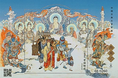 該套郵票是中國(guó)郵政自2015年發(fā)行的《中國(guó)古典文學(xué)名著——〈西游記〉》系列郵票的第五組,描繪了小說(shuō)第七十四回至第一百回的五段故事場(chǎng)景。4枚郵票分別表現(xiàn)的是,孫悟空在獅駝嶺大戰(zhàn)青毛獅子、黃牙老象、大鵬雕三怪時(shí)激烈的打斗場(chǎng)景;孫悟空、豬八戒為救助被當(dāng)作藥引的比丘國(guó)眾孩童,在南極仙翁幫助下收服白鹿精、擒殺白面狐貍的場(chǎng)景;哪吒隨孫悟空去陷空山無(wú)底洞,擒獲欲強(qiáng)迫唐僧成親的金鼻白毛老鼠精的場(chǎng)景;孫悟空領(lǐng)著月宮主人太陰星君來(lái)到天竺國(guó),收服假冒公主的廣寒宮搗藥玉兔的場(chǎng)景。小型張表現(xiàn)了師徒四人和白龍馬取回真經(jīng)后,真身返回靈山,終成正果的場(chǎng)景。畫家運(yùn)用傳統(tǒng)工筆重彩的手法,同時(shí)注重以形寫神,人物刻畫逼真?zhèn)魃?,在方寸間生動(dòng)地演繹出大家熟知的故事情節(jié)。