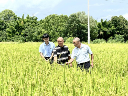 郵儲銀行贛州市分行客戶經(jīng)理劉巍與客戶一同察看水稻種植情況