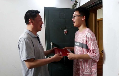王曉宏將國(guó)科大本科生錄取通知書(shū)郵件送到王鶴鳴手中。受訪者供圖
