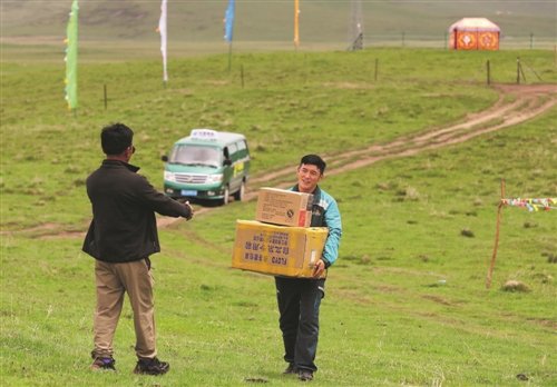 看到郵車來(lái)了,牧民迫不及待地迎上去接過(guò)自己網(wǎng)購(gòu)的商品。□《工人日?qǐng)?bào)》記者 王偉偉 攝