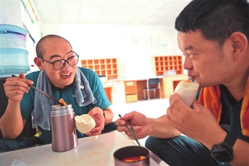 許桂明和同事插空吃簡單的午飯。