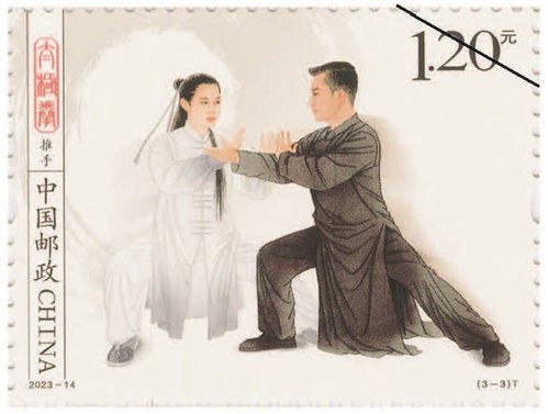 該套郵票一套3枚,圖案內(nèi)容分別為拳術(shù)、器械、推手。郵票采用工筆人物形式表現(xiàn),整體色調(diào)以黑白灰為主,背景采用水墨飛白映襯太極拳平和、包容、大道至簡的意境。第一枚郵票表現(xiàn)了一位白發(fā)長須老者,正氣定神閑地做著太極拳單鞭動(dòng)作,體現(xiàn)出太極拳的傳統(tǒng)風(fēng)范和延年益壽的作用。背景用揮灑自如的水墨筆觸和肌理來表現(xiàn),伴隨老者動(dòng)作產(chǎn)生無形氣韻。第二枚郵票中是一位英姿颯爽的舞劍女子,背景中如影隨形的氣流若隱若現(xiàn),體現(xiàn)出太極劍行云流水的特點(diǎn)。第三枚郵票中是一對(duì)進(jìn)行太極拳推手的男女青年,一男一女、一黑一白象征太極的陰陽相濟(jì),背后的水墨肌理隱約形成陰陽的概念,刻畫出“陰陽太極本相隨、動(dòng)靜虛實(shí)把手推”的場景。