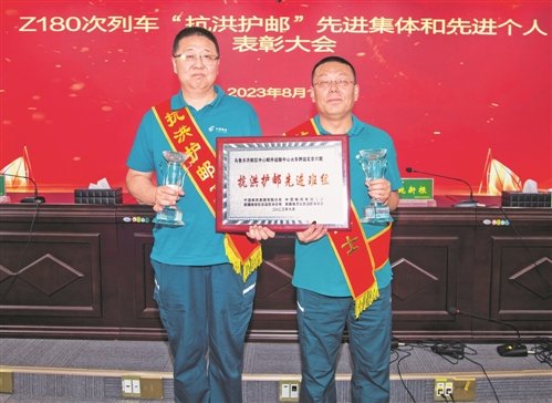 夏勇(右)和馬宏鈞手捧“抗洪護(hù)郵先進(jìn)班組”獎(jiǎng)牌和“抗洪護(hù)郵衛(wèi)士”獎(jiǎng)杯,接受現(xiàn)場(chǎng)參會(huì)人員對(duì)英雄的禮贊?!醢怖?攝