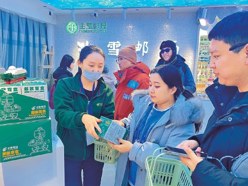 圖為游客在冰雪大世界主題郵局選購(gòu)文創(chuàng)產(chǎn)品。