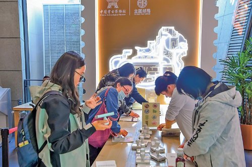 游客在中國工藝美術(shù)博物館(中國非物質(zhì)文化遺產(chǎn)館)主題郵局內(nèi)打卡蓋戳。 □馬佳玉 攝